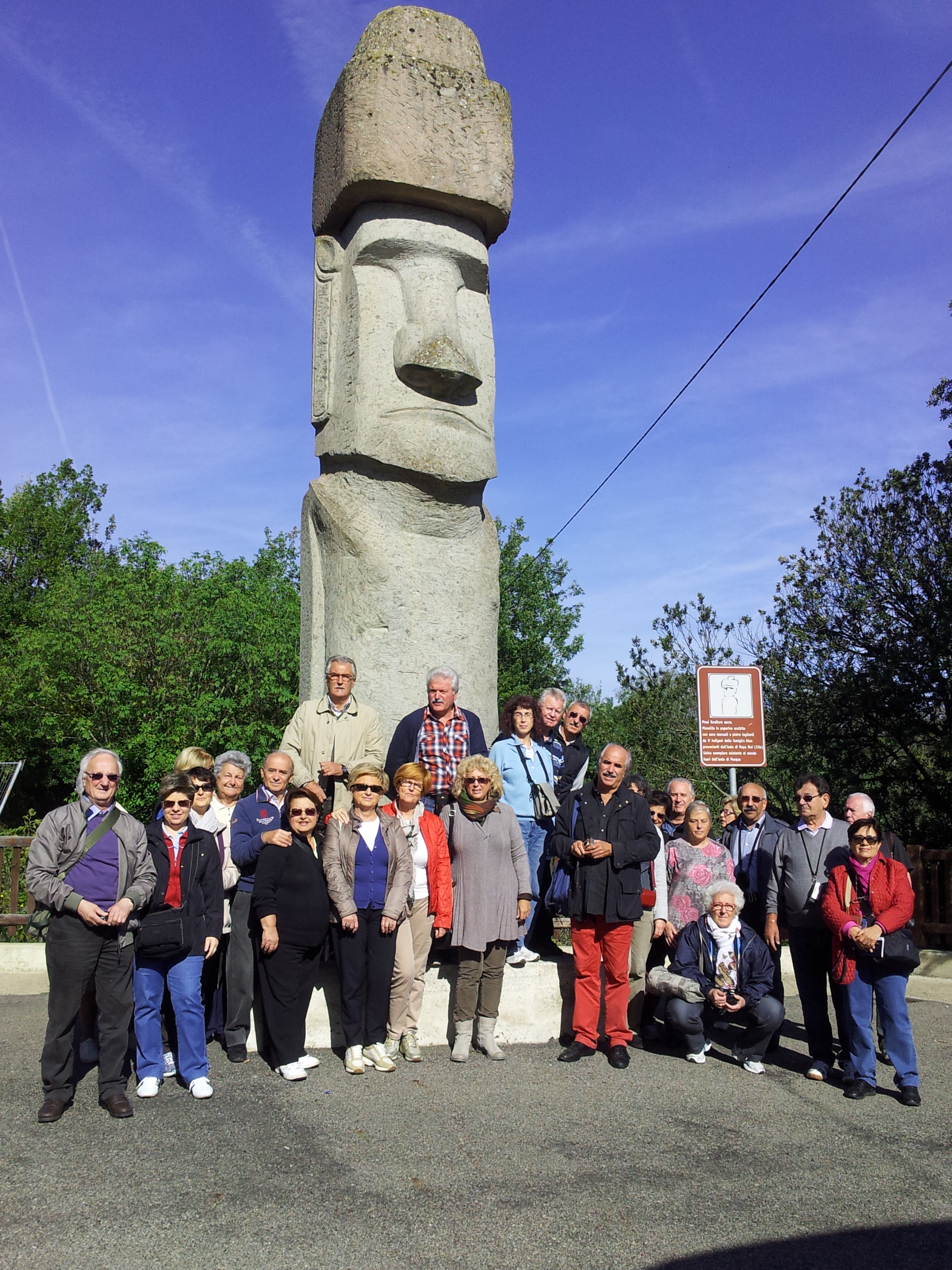 Ho scritto più volte sul Moai di Vitorchiano (Vt) e non mi stanco mai di farlo. Quando mi ci trovo davanti provo sempre una grande emozione mista a stupore. Questa volta sono insieme al gruppo dell’Alto Adige dell’Associazione Il Gabbiano, in tour per una settimana, e non posso permettermi di tralasciare uno dei monumenti più originali che la Tuscia ha il vanto di custodire e che io adoro. Si tratta dell’unico esemplare di Moai al mondo al di fuori dell’isola di Rapa Nui (in polinesiano “la grande Roccia”). Alto dieci metri, realizzato a mano da indigeni con asce e pietre taglienti, accoglie il visitatore con il suo aspetto misterioso e affascinante. Forse personificazione degli antenati, forse essere in contatto con le divinità, il Moai assicura buona ventura e per ottenerla bisogna avvicinarsi e toccarlo con mani. E’ quello che propongo ai miei ospiti e l’occasione è buona per una bella foto ricordo!