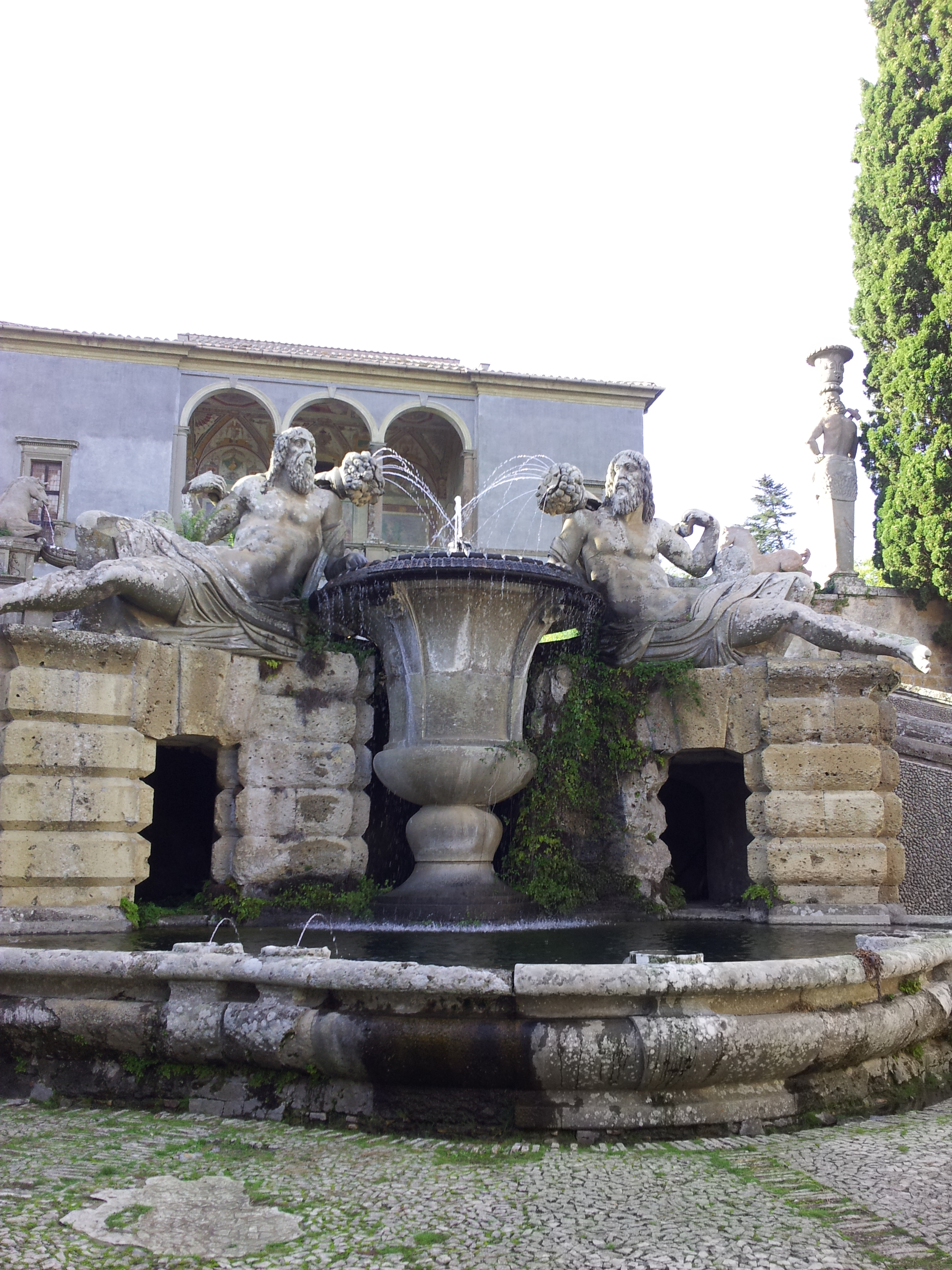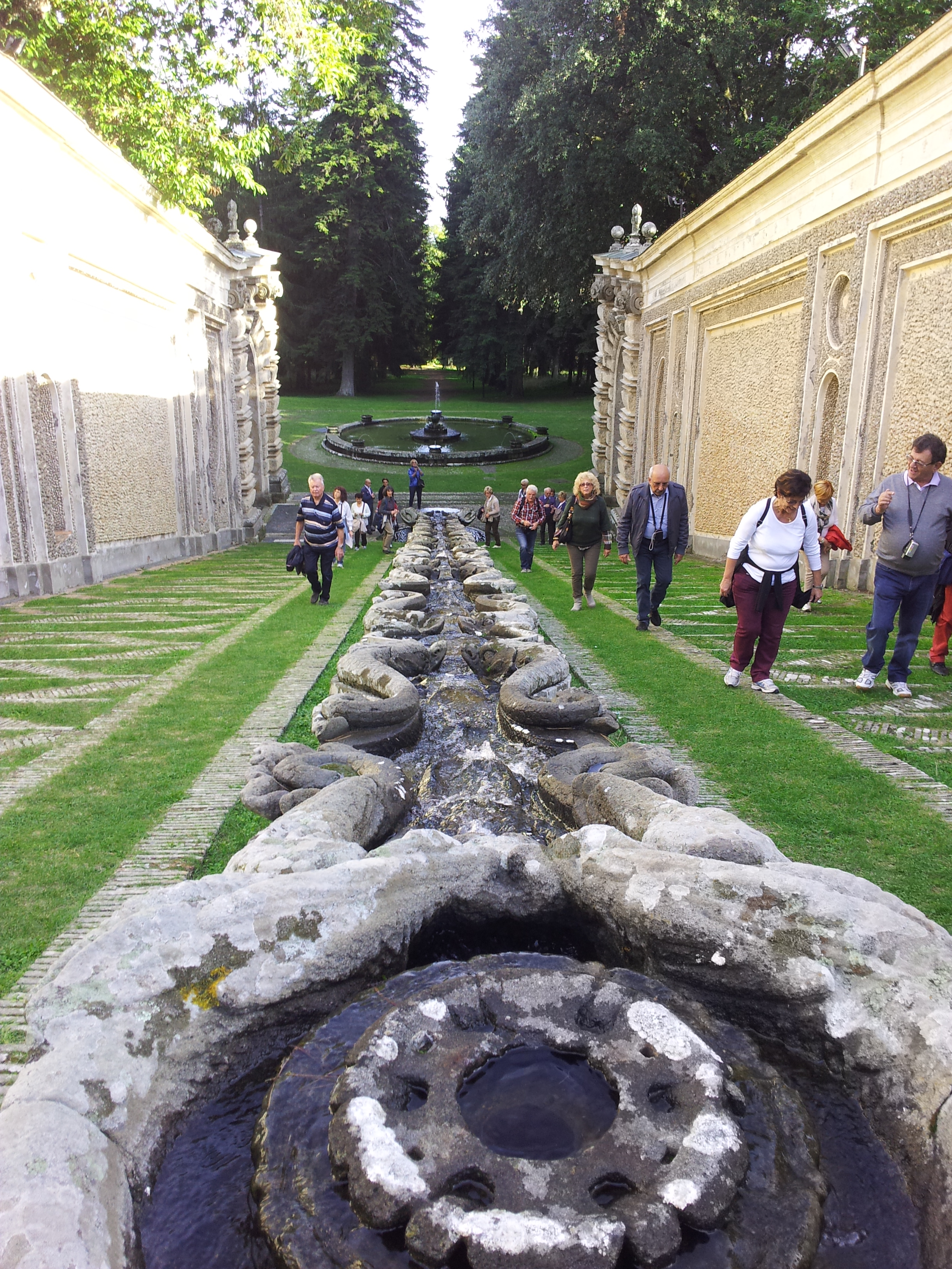 Un percorso ascensionale scandito da ripiani e terrazze con fontane e giochi d’acqua, che ha come fondale prospettico la Palazzina del Piacere. Il complesso è realizzato sfruttando la conformazione collinosa del terreno. Dal ripiano inferiore con la Fontana del Giglio, da cui si innalzano altissimi getti d’acqua, attraverso due scale inquadrate da padiglioni a volta e separate da una Catena dei delfini che versano acqua in conchiglie, lo sguardo corre verso il fondale prospettico costituito dalla Fontana dei Fiumi e dalla Palazzina del Piacere. La prima rappresenta i fiumi Tevere e Arno ed è formata da due statue che gettano acqua in un gigantesco vaso centrale; la Casina del Piacere era la residenza estiva del cardinale. E’ circondata da giardini segreti ai cui lati si trovano le cariatidi, grandi sculture in peperino opera di Pietro Bernini, padre di Gianlorenzo, che la tradizione popolare vuole siano le caricature dei cittadini di Caprarola che lavorarono nella villa.